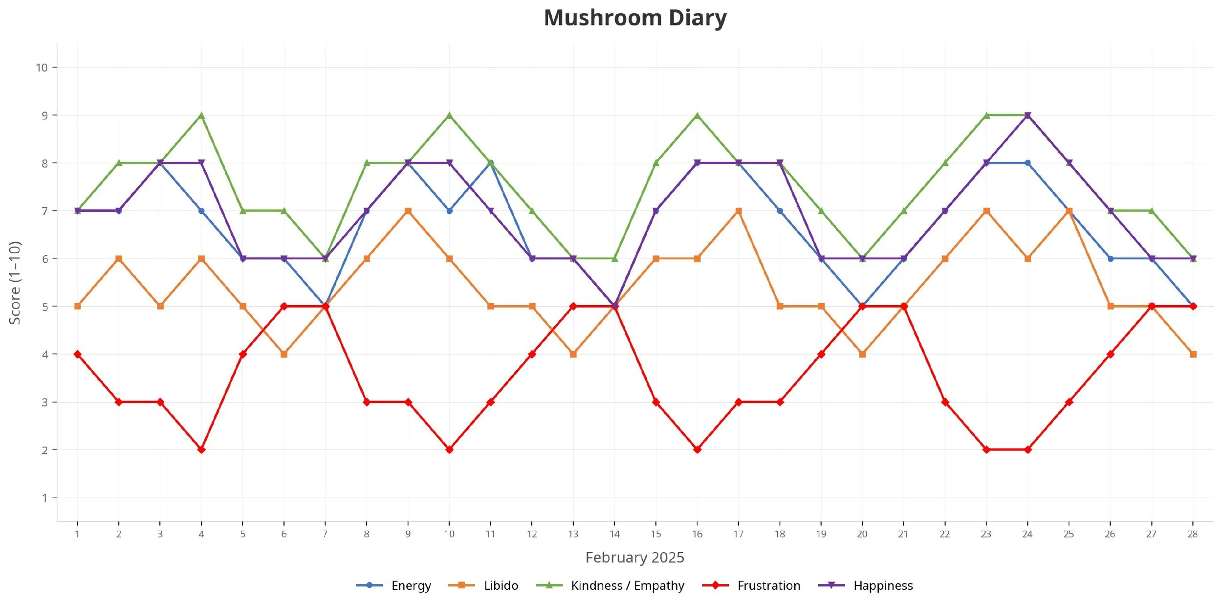 Energy saw a noticeable uptick, particularly on days 2–4 of each cycle. Kindness and empathy were the most consistently elevated metrics — I found myself genuinely more interested in other people’s experiences and less reactive to minor annoyances. Frustration dropped, though I can’t fully separate that from the general mood improvement. Happiness was modestly but reliably higher.